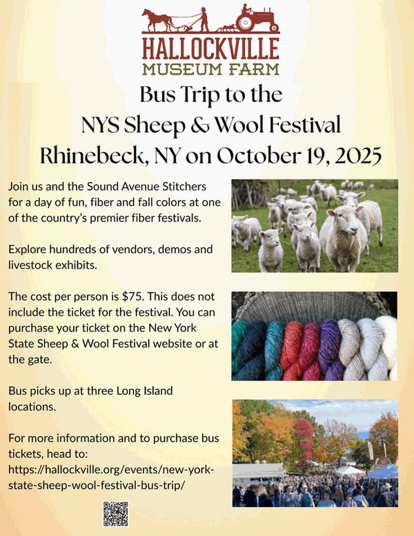 Hallockville Museum Farm is sponsoring a bus trip to Rhinebeck Dutchess County Fairgrounds with the Sound Avenue Stitchers for the New York State Sheep & Wool Festival on Sunday, October 19, 2025.